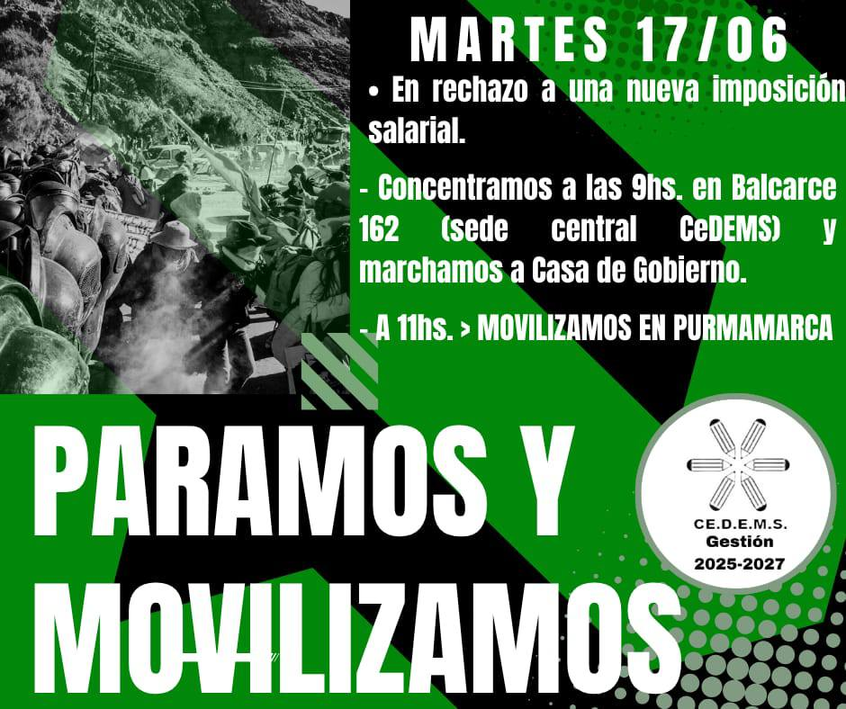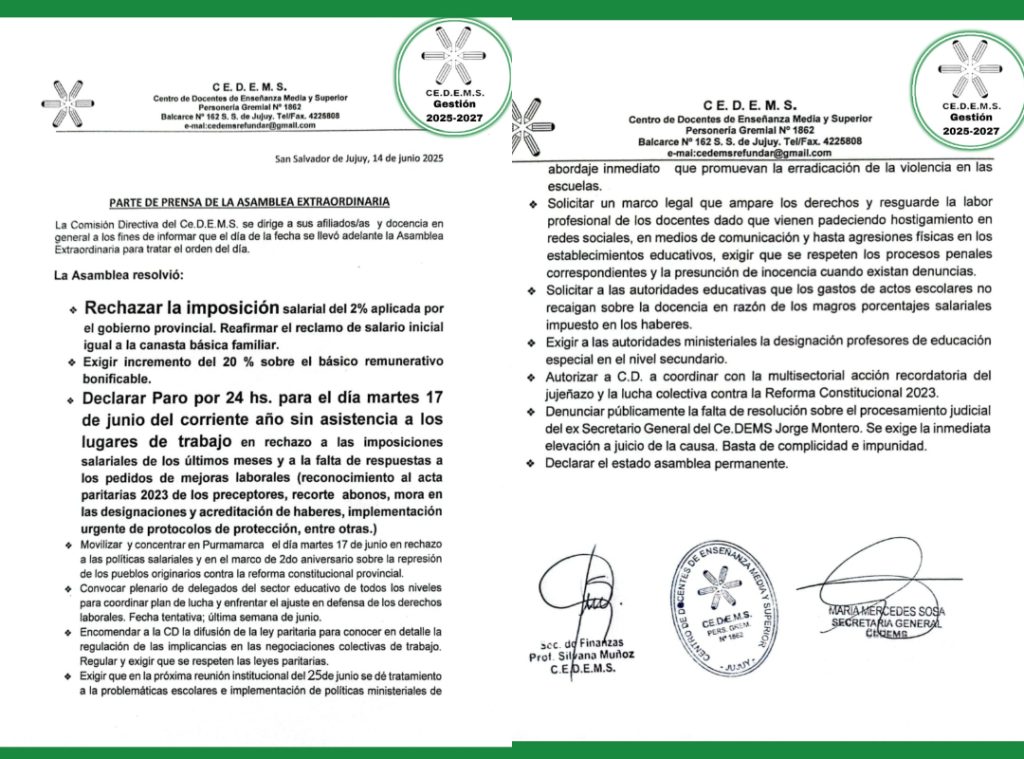 El Centro de Docentes de Enseñanza Media y Superior (CEDEMS) de Jujuy resolvió en su última asamblea, efectuar una jornada de paro por 24 horas para el martes 17 de junio, en rechazo a la propuesta salarial del 2 % mensual ofrecida por el gobierno provincial.