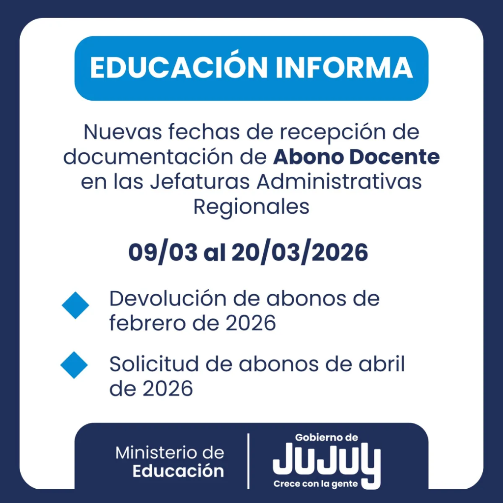 El Ministerio de Educación de Jujuy informó las fechas para realizar las gestiones vinculadas al abono docente y la presentación de legajos, que deberán efectuarse en las jefaturas administrativas regionales correspondientes.