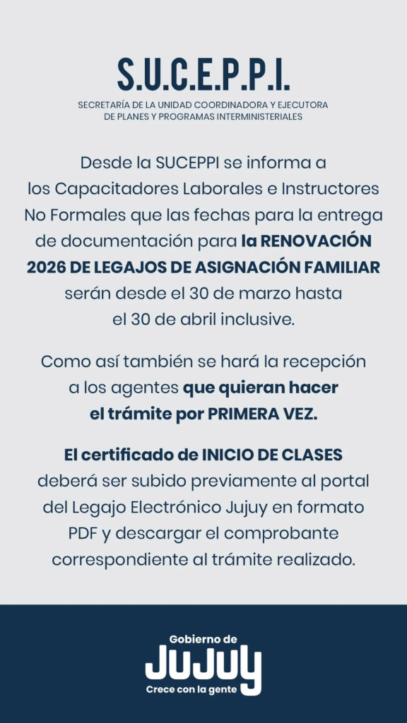La Secretaría de la Unidad Coordinadora y Ejecutora de Planes y Programas Interministeriales (SUCEPPI) informó que ya se encuentra habilitado el período de renovación 2026 de legajos de asignación familiar, destinado a capacitadores laborales e instructores no formales. El trámite podrá realizarse hasta el próximo 30 de abril y también está abierta la posibilidad para quienes deseen iniciarlo por primera vez.