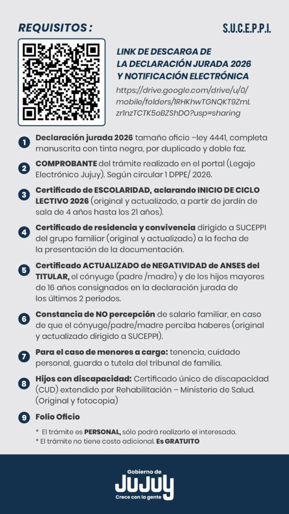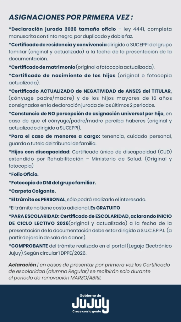 Desde el organismo remarcaron que el trámite es personal, gratuito y requiere que toda la documentación esté actualizada al momento de la presentación. Además, indicaron que el certificado de inicio de clases debe cargarse previamente en formato digital en el portal de Legajo Electrónico Jujuy, desde donde se deberá descargar el comprobante correspondiente.