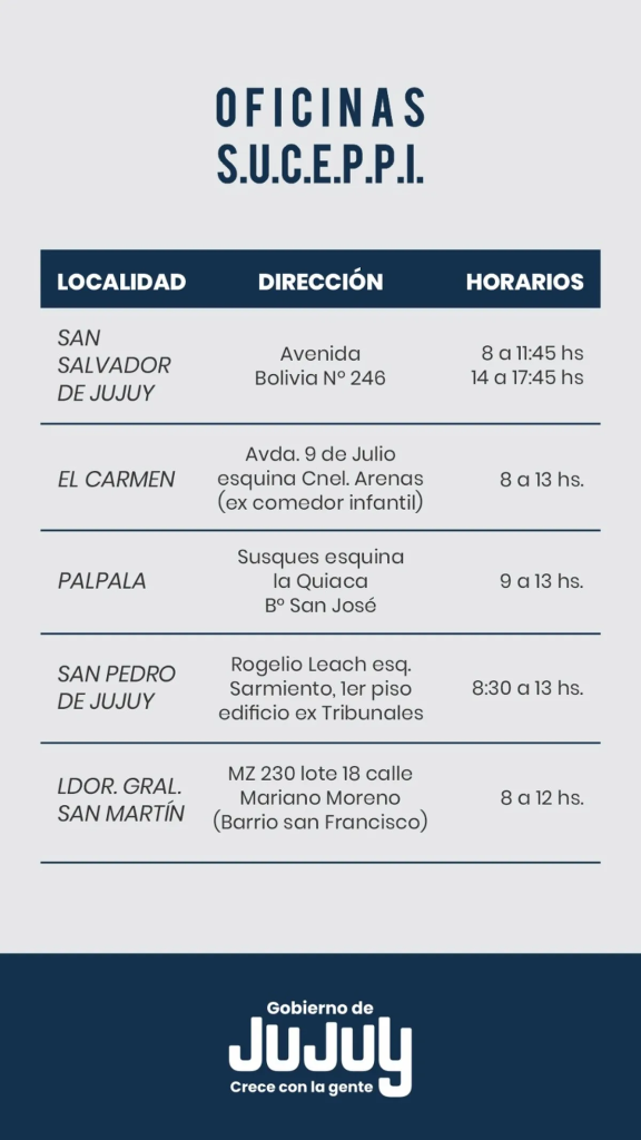 Para facilitar el acceso, SUCEPPI dispuso distintos puntos de atención en la provincia. En San Salvador de Jujuy, la atención se realiza en Av. Bolivia N° 246, en doble turno. También hay oficinas habilitadas en El Carmen, Palpalá, San Pedro de Jujuy y Libertador General San Martín, con horarios matutinos.