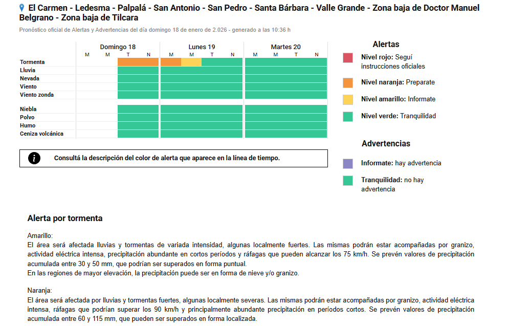 El área bajo alerta naranja comprende las zonas montañosas de los departamentos Doctor Manuel Belgrano, Humahuaca, Tilcara y Tumbaya, además de El Carmen, Ledesma, Palpalá, San Antonio, San Pedro, Santa Bárbara y Valle Grande, junto a sectores bajos de Belgrano y Tilcara.