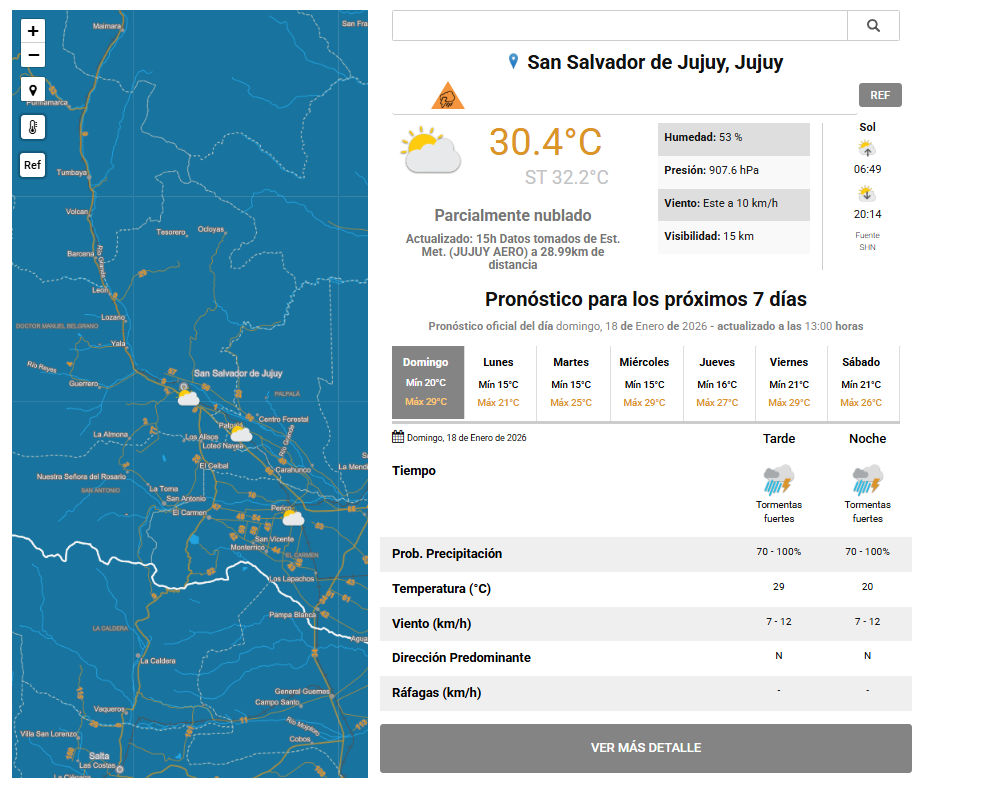 En cuanto a las condiciones actuales, el registro oficial del SMN indica que en San Salvador de Jujuy y alrededores la temperatura ronda los 30 grados, con cielo parcialmente nublado y una humedad cercana al 50%. Para el resto de la jornada y la noche se anticipa una alta probabilidad de tormentas fuertes, con precipitaciones que podrían alcanzar entre el 70% y el 100%. Además, se esperan vientos leves del sector este y un marcado descenso de temperatura hacia la noche, en línea con el alerta vigente para gran parte de la provincia.