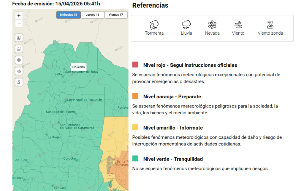 El Servicio Meteorológico Nacional informó que la provincia de Jujuy se encuentra bajo nivel verde, lo que indica ausencia de fenómenos meteorológicos que impliquen riesgos para la población. En este marco, San Salvador de Jujuy transita una jornada inicialmente estable, con condiciones climáticas favorables durante la mañana.