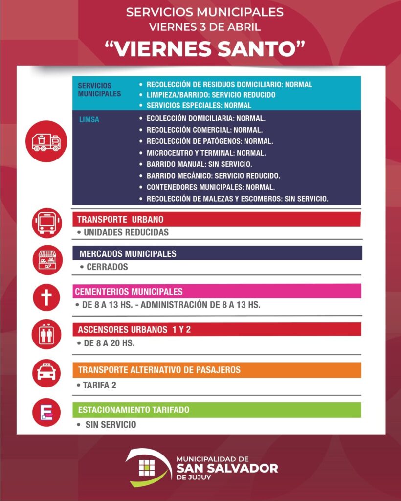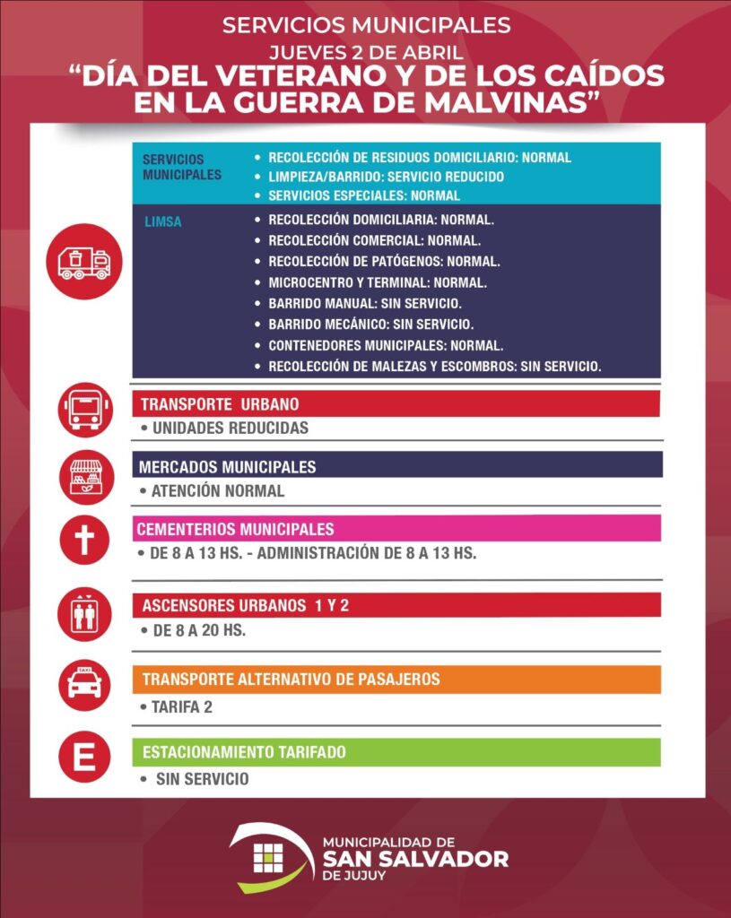 Con motivo de los feriados por el Día del Veterano y de los Caídos en la Guerra de Malvinas y el Viernes Santo, la Municipalidad de San Salvador de Jujuy dio a conocer el esquema especial de servicios que regirá durante el jueves 2 y viernes 3 de abril. El objetivo es garantizar la prestación de servicios esenciales, aunque con modificaciones en algunas áreas.