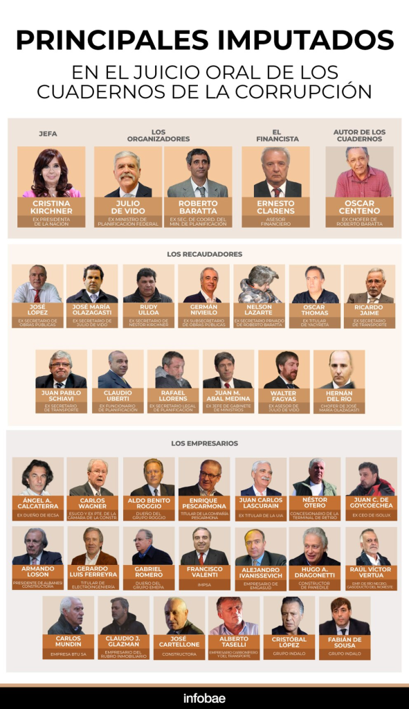 La acusación contra Cristina Fernández de Kirchner es contundente:“Se encuentra acreditada su intervención en dicha asociación ilícita en carácter de jefa, rol que también cumpliera Néstor Carlos Kirchner, quienes detentaron el cargo de presidente de la República Argentina que ejercieron entre el 10 de diciembre de 2007 hasta el 9 de diciembre de 2015, y entre 25 de mayo de 2003 y el 9 de diciembre de 2007, respectivamente”.