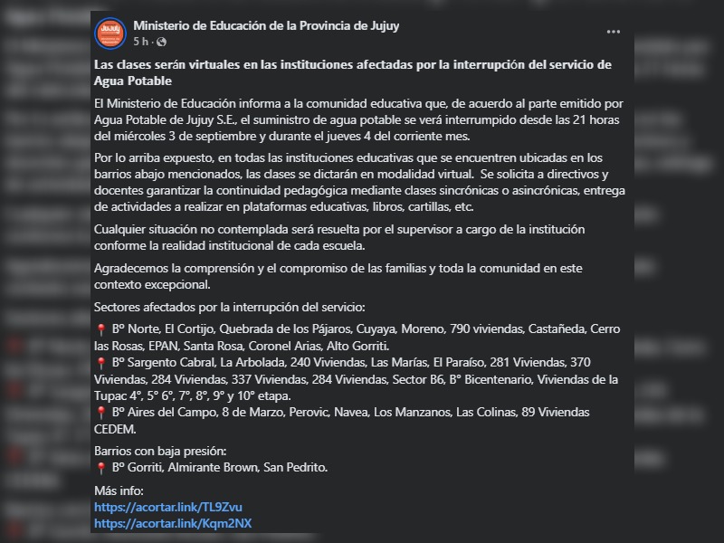 Ante ese escenario, el Ministerio de Educación de Jujuy informó que los establecimientos educativos ubicados en los barrios alcanzados por la interrupción del servicio dictarán clases en modalidad virtual los días miércoles 3 y jueves 4 de septiembre. La medida busca garantizar la continuidad pedagógica y evitar inconvenientes sanitarios derivados de la falta de agua en los edificios escolares.
