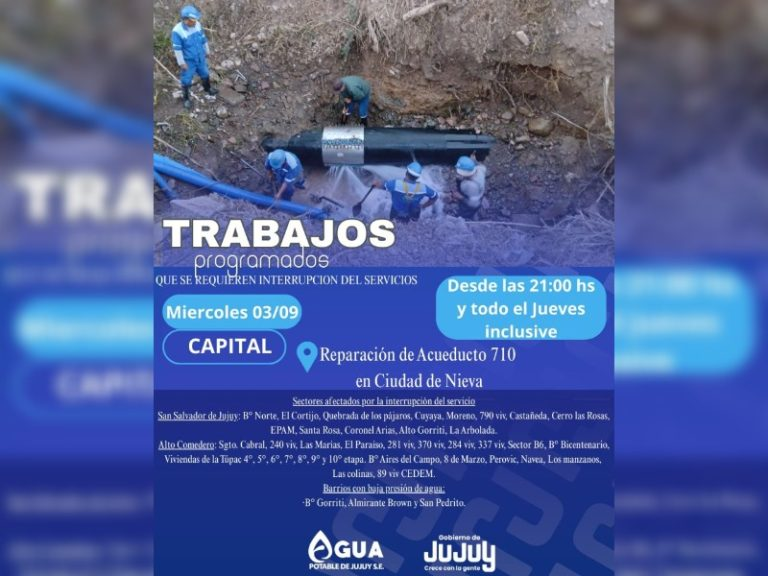 Agua Potable de Jujuy S.E. comunicó que desde las 21:00 del miércoles 3 de septiembre se ejecutará un corte programado en el suministro de agua potable para realizar una reparación definitiva en el acueducto principal de Ciudad de Nieva. El corte se extenderá durante unas 24 horas, con normalización gradual prevista para la tarde del jueves 4.