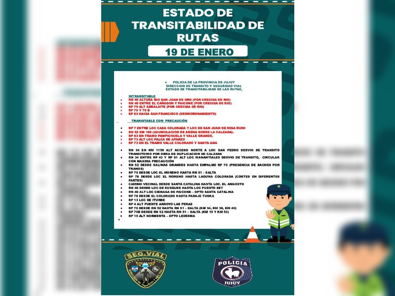 Según el reporte oficial del 19 de enero, varias rutas nacionales y provinciales permanecen intransitables por crecidas de ríos y desmoronamientos, arrastre de material, socavones y daños estructurales ocasionados por el temporal del domingo. Entre ellas se encuentran: