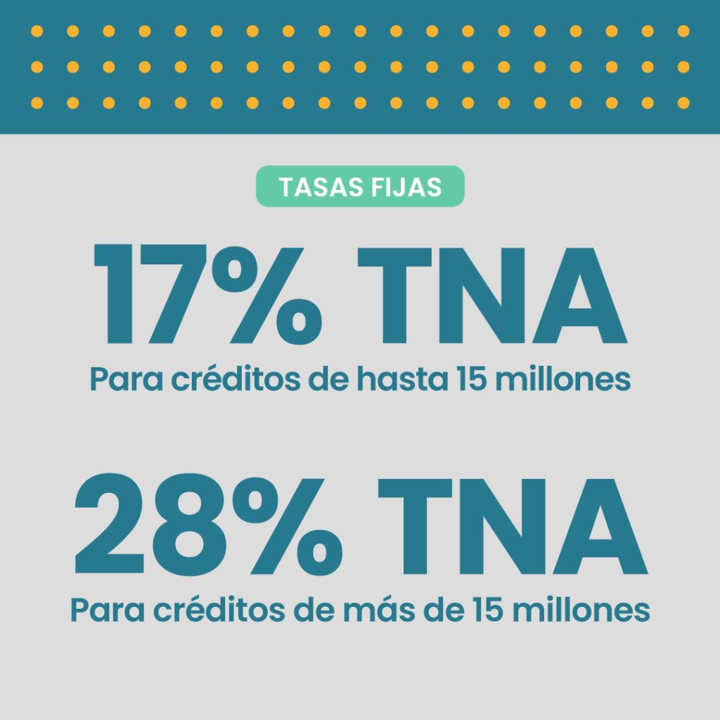 De acuerdo a lo informado, no existe un monto mínimo de financiamiento y actualmente los créditos pueden alcanzar hasta 50 millones de pesos. Las tasas vigentes son del 17% para montos de hasta 20 millones y del 28% para préstamos de entre 20 y 50 millones, con plazos de devolución de hasta 60 meses.