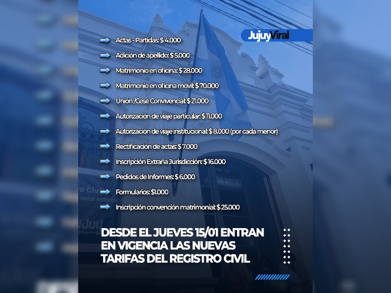 La Dirección Provincial del Registro Civil de Jujuy informó que a partir del jueves 15 de enero entrarán en vigencia nuevos valores para distintos trámites vinculados a la identidad de las personas. La actualización se enmarca en lo establecido por la Ley Impositiva N.º 6492/2025, dependiente del Ministerio de Hacienda y Finanzas de la Provincia y contempla un ajuste moderado en los aranceles de los servicios que presta el organismo.