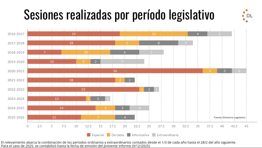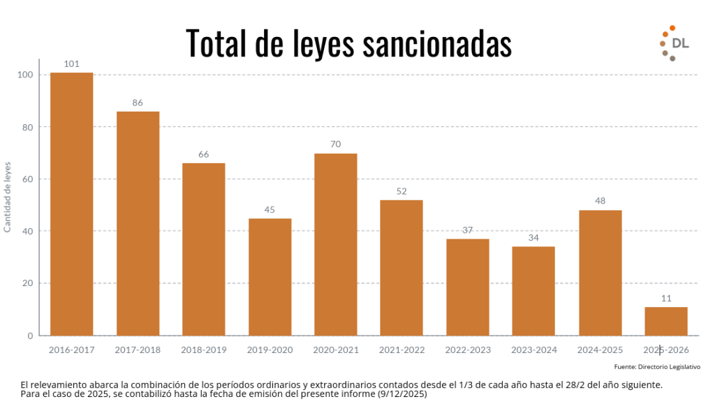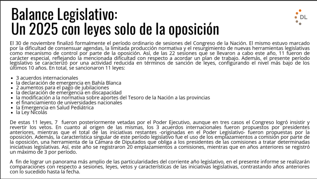 El año parlamentario llegó a su fin con resultados limitados y un nivel de actividad que quedó por debajo de los registros de los últimos diez años. A lo largo de 2025, el Congreso celebró 22 sesiones, la mitad de ellas de carácter especial, y concluyó el período con 11 leyes sancionadas, 20 emplazamientos a comisión, 7 vetos presidenciales y el rechazo de 5 decretos de necesidad y urgencia (DNU).