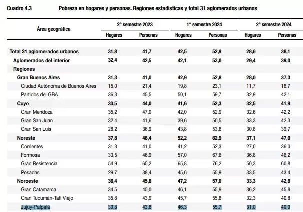 - Jujuy–Palpalá (1T 2024): según datos año contra año, la región presentaba una tasa de desocupación de 7,7 %