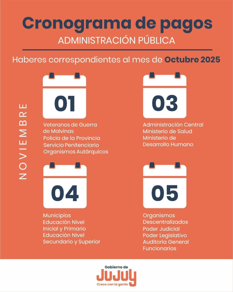 El Gobierno provincial dio a conocer el cronograma de pagos correspondiente a los haberes de octubre 2025 para los trabajadores de la administración pública, que se acreditarán entre el 1 y el 5 de noviembre.