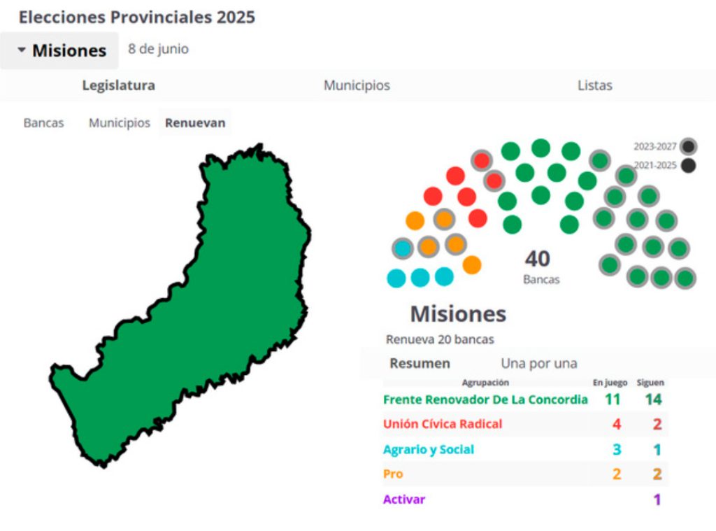Al igual que en los demás comicios realizados en lo que va de 2025, la pulseada misionera tuvo una baja participación, que rozó el 58%. Con el 98,9% de las mesas escrutadas, el FRC obtiene el 28,6% de los votos, mientras que LLA sumaba el 21,89%. Amarilla, por su parte, cosechaba el 19,12%, mientras que Héctor Bárbaro, del Frente Agrario y Social ostentó el 8,88%.