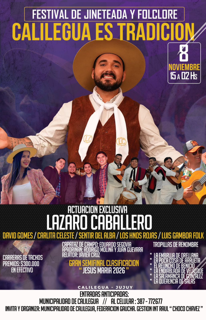 Organizado por la Municipalidad de Calilegua en conjunto con la Federación Gaucha Jujeña, el festival incluirá la gran semifinal clasificatoria rumbo a Jesús María 2026, con la participación de tropillas reconocidas y premios por $300.000 en efectivo. Además, contará con la actuación estelar de Lázaro Caballero, acompañado por David Gómez, Carlita Celeste, Sentir del Alba, Los Hermanos Rojas y Luis Gamboa Folk, entre otros grupos locales.