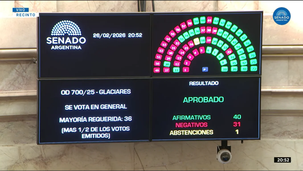 En su penúltima sesión extraordinaria, el Senado aprobó modificaciones a la Ley de Glaciares por 40 votos a favor y 31 en contra, con una abstención de la neuquina Julieta Corroza. La definición final del proyecto quedó ahora en manos de la Cámara de Diputados. La iniciativa generó fuertes divisiones internas en varios bloques, con excepción de La Libertad Avanza, conducido en la Cámara alta por Patricia Bullrich.