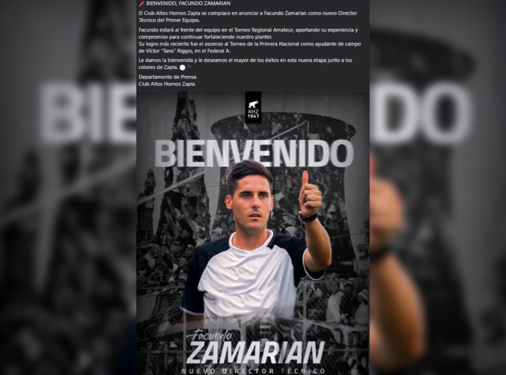 Prácticamente en el mismo anuncio (porque se publicó 1 minuto después) la institución merengue confirmó la llegada de Facundo Zamarián como nuevo director técnico, reconociendo que el entrenador estará con inmediata disposición al frente del plantel en el próximo Torneo Regional Federal Amateur.