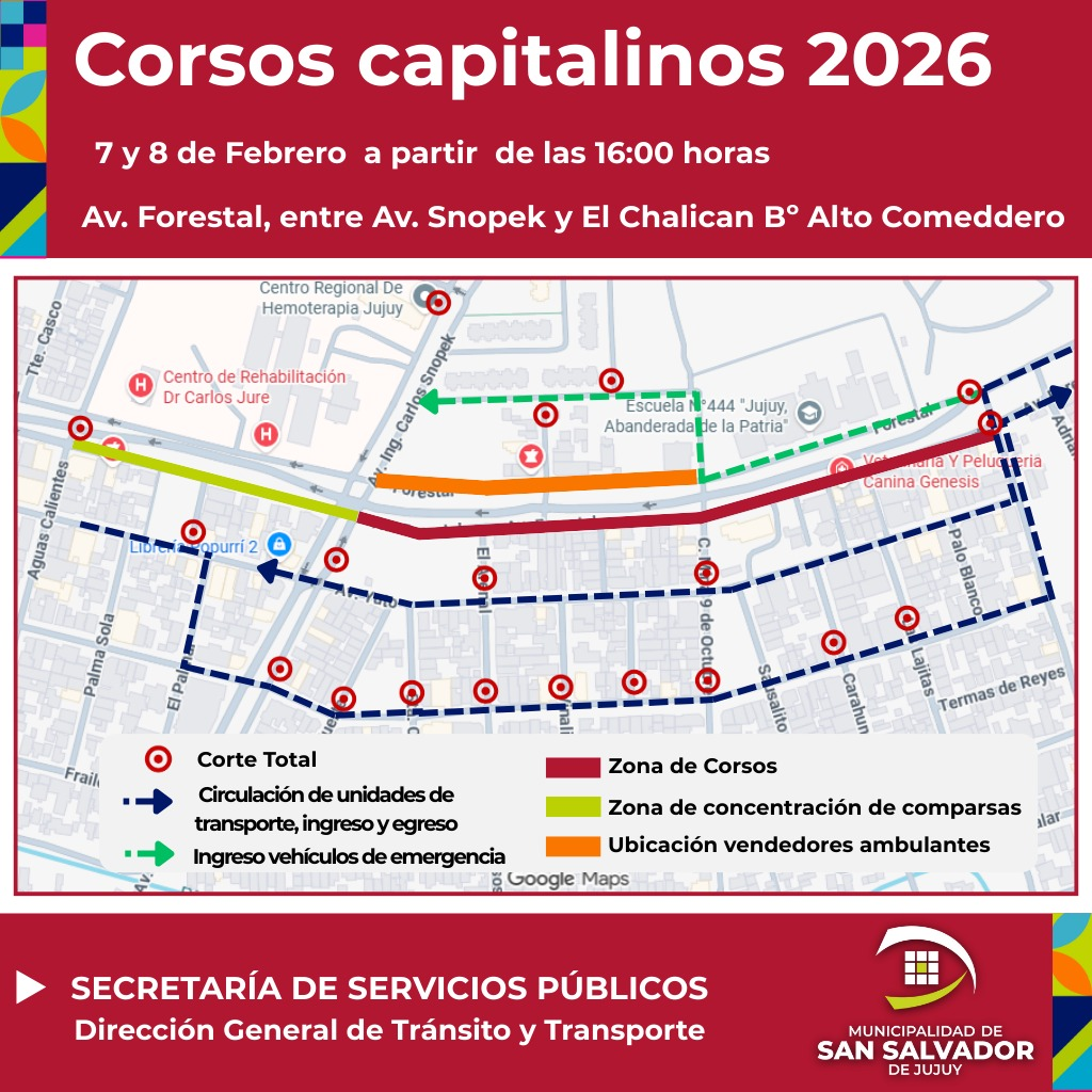 La Municipalidad de San Salvador de Jujuy informó cambios en el tránsito y en los recorridos del transporte público como parte de la organización de los Corsos Capitalinos 2026, que se realizarán los días 7 y 8 de febrero sobre la Avenida Forestal.