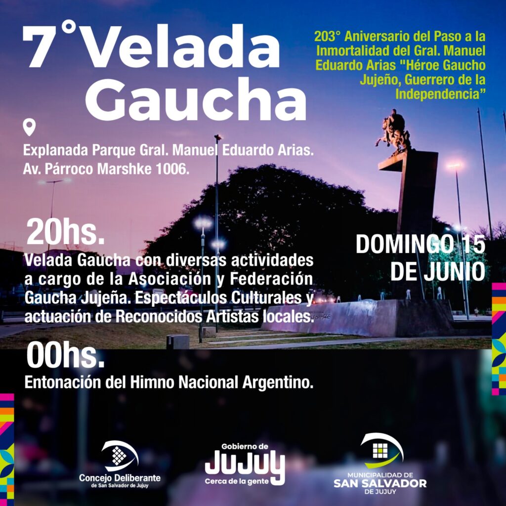 Esta noche se llevará a cabo una nueva edición de la Velada Gaucha en homenaje al General Manuel Eduardo Arias, figura clave en la historia de la independencia y símbolo de la identidad jujeña. La actividad será en el Parque General Arias y comenzará a las 19 horas, invitando a toda la comunidad a compartir una tarde cargada de cultura, memoria y tradición.