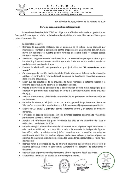 El Centro de Docentes de Enseñanza Media y Superior (CEDEMS) resolvió convocar a un paro por 48 horas para los días lunes 2 y martes 3 de marzo, coincidiendo con el inicio del ciclo lectivo en la provincia de Jujuy. La medida fue definida en una asamblea extraordinaria luego de que el gremio analizara la última oferta salarial presentada por el Gobierno provincial en el marco de la negociación paritaria.