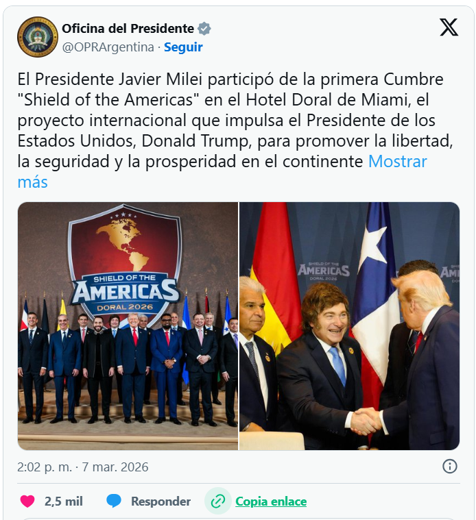 En ese marco, la presencia de Milei fue leída como una señal del lugar que la administración republicana le asigna a la Argentina dentro del nuevo esquema de alianzas regionales que Washington busca consolidar.