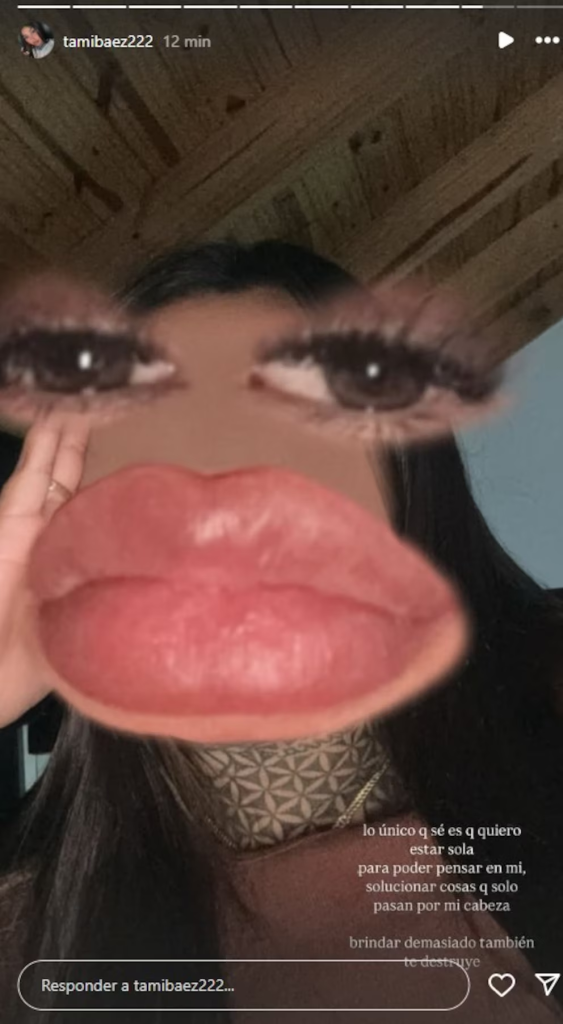 La mañana de este jueves, Tamara Báez sorprendió a sus seguidores con un mensaje en sus historias de Instagram que marcó un nuevo giro en su situación sentimental. “Lo único que sé es que quiero estar sola para poder pensar en mí, solucionar cosas que solo pasan por mi cabeza. Brindar demasiado también te destruye”, escribió la influencer junto a una imagen con un filtro de ojos y boca exagerados imitando a un animal.