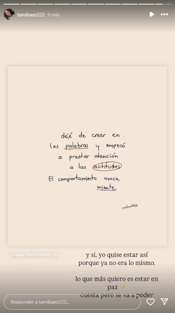 Su mensaje, breve pero contundente, deja entrever un momento de introspección. Tamara sumó una cita tomada de internet que profundiza su distanciamiento emocional. “Dejé de creer en las palabras y empecé a prestar atención a las actitudes. El comportamiento nunca miente”, lanzó, antes de confesar: “Y sí, yo quise estar así porque no era lo mismo. Lo que más quiero es estar en paz. Cuesta pero se va a poder”.