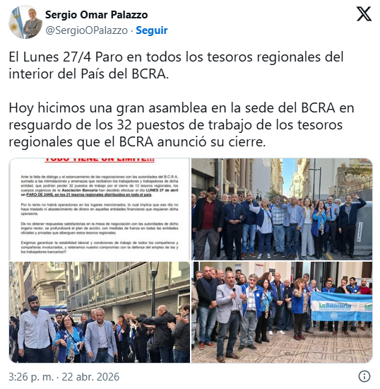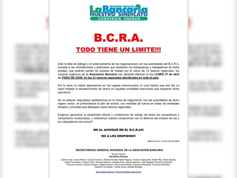 La Asociación Bancaria, conducida por Sergio Palazzo, confirmó la realización de un paro total de actividades en los tesoros regionales del Banco Central de la República Argentina (BCRA) para el próximo lunes 27 de abril. La decisión se tomó tras el estancamiento de las negociaciones con las autoridades del organismo rector, en un contexto de creciente tensión por el anuncio del cierre de 12 tesoros regionales en distintos puntos del país.