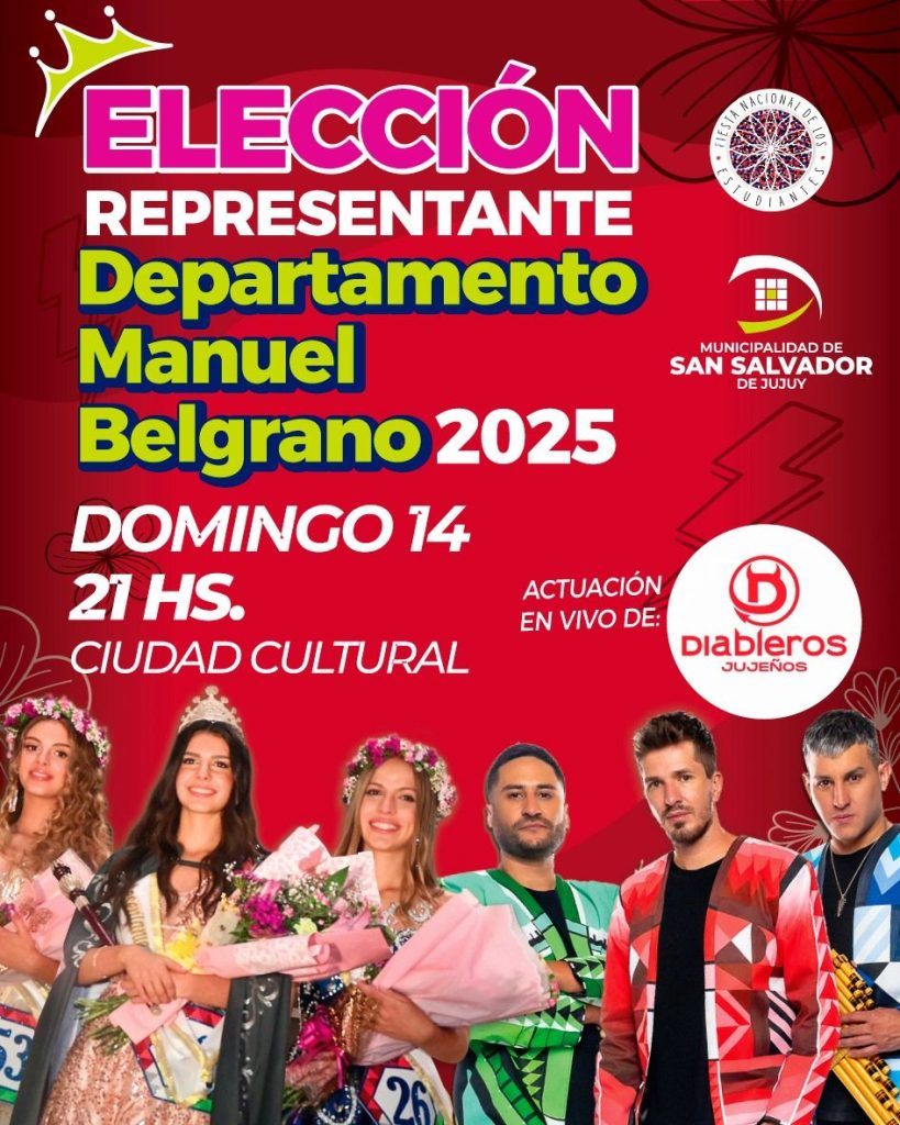 San Salvador de Jujuy se prepara para una nueva noche de celebración estudiantil en el marco de la Fiesta Nacional de los Estudiantes (FNE). Este domingo 14 de septiembre, desde las 21 horas en Ciudad Cultural, se llevará adelante la Elección de la Representante del Departamento Manuel Belgrano 2025.