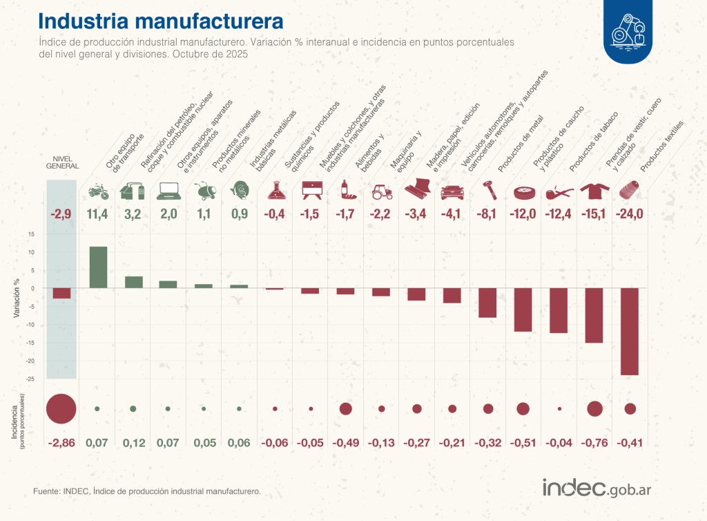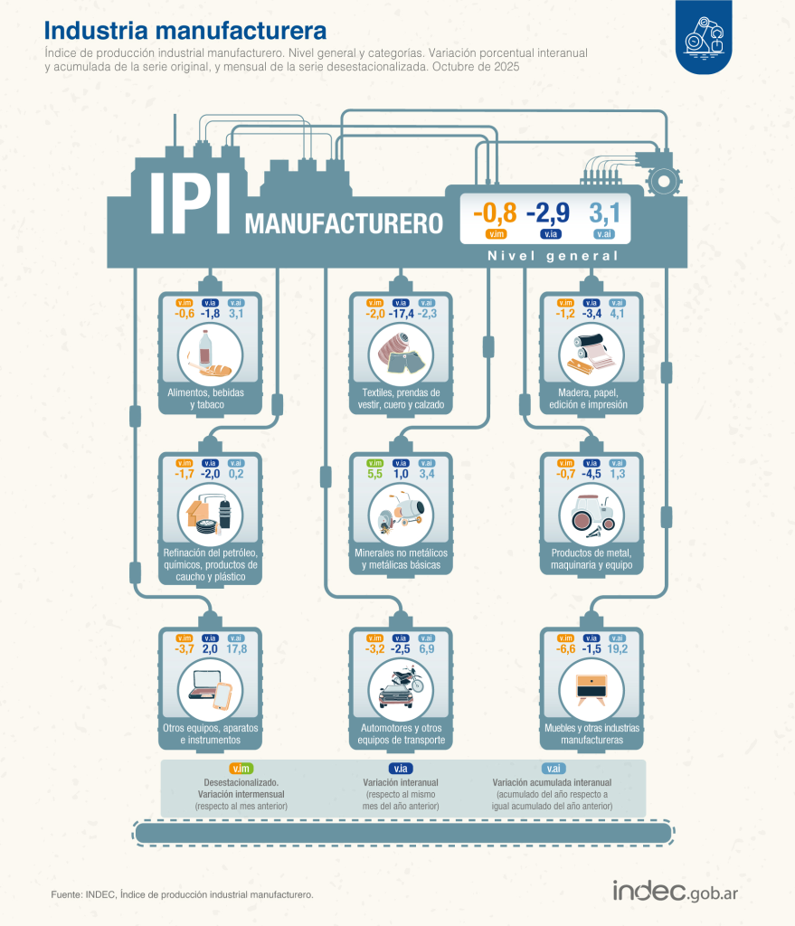 La actividad industrial volvió a registrar una caída en octubre y profundizó un escenario de estancamiento que ya se extiende desde hace varios meses. Según los últimos datos oficiales difundidos por el INDEC, el Índice de Producción Industrial (IPI) manufacturero retrocedió 2,9% interanual, acumulando además una baja del 3,1% en lo que va del año. En términos mensuales, la industria también mostró una contracción del 0,8% respecto de septiembre, ya con datos desestacionalizados.