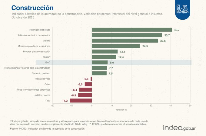 El panorama de la construcción es puntualmente más alentador. El Indicador Sintético de la Actividad de la Construcción (ISAC) también mostró fuertes contrastes entre insumos, aunque con un balance algo más positivo. Mientras algunos materiales vinculados a obras puntuales exhibieron subas importantes —como el hormigón elaborado (+40,7%), los artículos sanitarios de cerámica (+35,7%) y el asfalto (+33,6%)—, otros insumos claves para el desarrollo habitacional siguieron en caída.