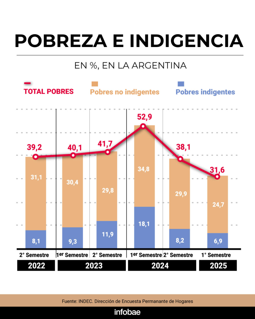 El Instituto Nacional de Estadística y Censos (Indec) dio a conocer este jueves el dato de incidencia de la pobreza correspondiente al primer semestre de 2025 en los principales centros urbanos del país, que se ubicó en 31,6%.