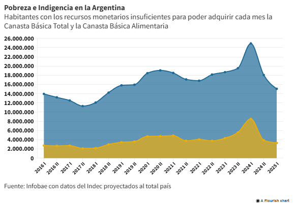 En la extrapolación al total del país, esa cifra significa que hay 15,05 millones de argentinos en la pobreza y 3,39 millones en la indigencia, en comparación con el primer semestre de 2024. Si se toma el final de 2023, cuando asumió Javier Milei, hay 4,48 millones de pobres y 2,29 millones de indigentes menos.