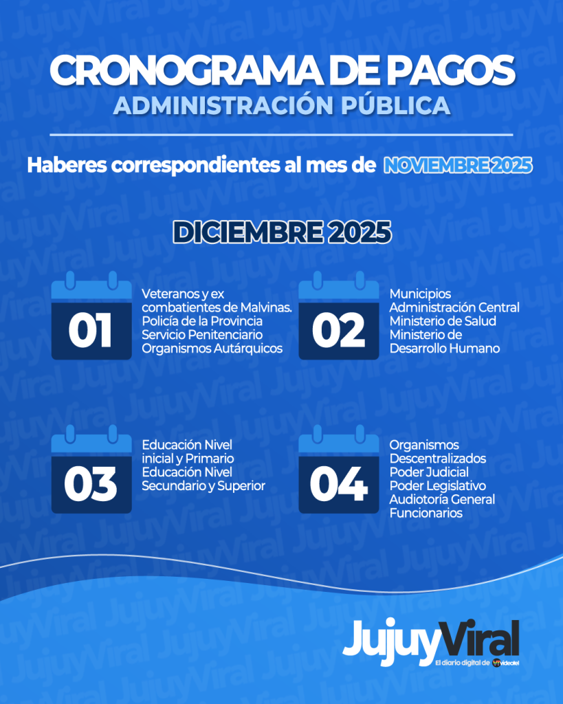 El Gobierno provincial informó que el calendario de pago de haberes correspondientes a noviembre de 2025 para todo el personal de la Administración Pública Provincial comenzará el lunes 1° de diciembre y se extenderá hasta el jueves 4, de acuerdo con el cronograma establecido.