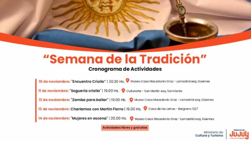 La celebración del Día de la Tradición se vivirá durante toda una semana con una agenda de cinco propuestas culturales gratuitas, organizadas por el Ministerio de Cultura y Turismo de la Provincia. Del 10 al 14 de noviembre, distintos espacios culturales de la capital abrirán sus puertas con entrada libre para disfrutar de espectáculos, talleres y charlas dedicadas a las raíces criollas.