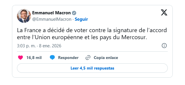 El presidente de Francia, Emmanuel Macron, anunció que su país votará en contra del acuerdo de libre comercio entre la Unión Europea y el Mercosur en la próxima reunión en Bruselas, una decisión que refleja el rechazo político unánime expresado en el plano interno y la presión creciente del sector agrícola francés frente al avance del tratado.