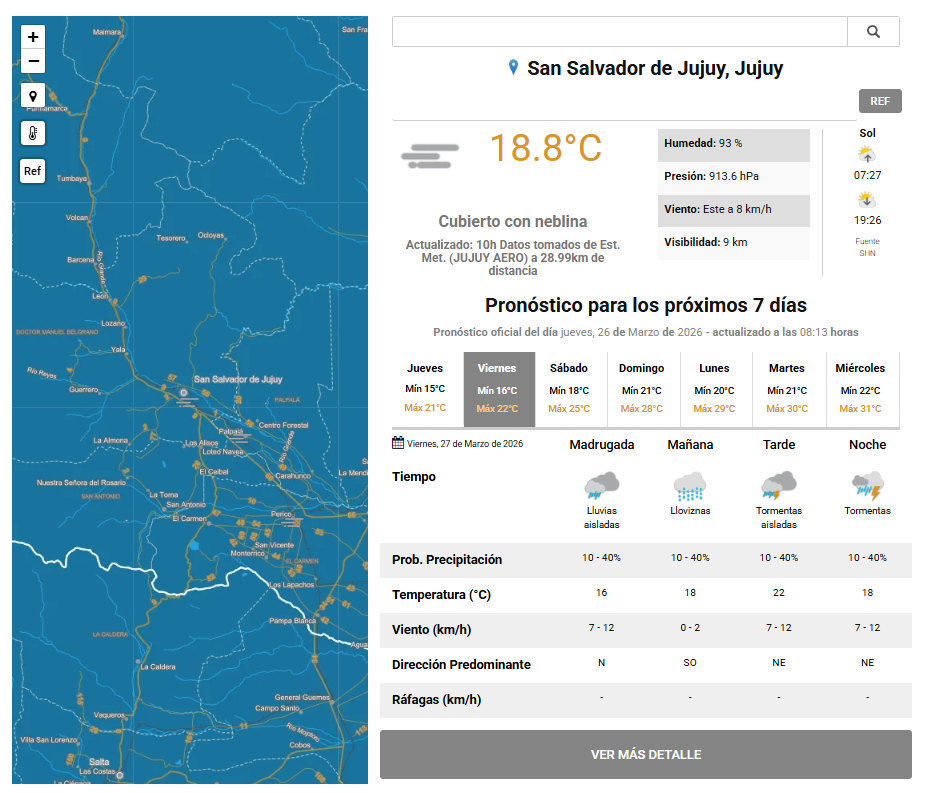 El tiempo en San Salvador de Jujuy y la región de los Valles se presenta inestable antes de iniciar el fin de semana, en línea con lo que ya se venía anticipando en reportes previos del Servicio Meteorológico Nacional. A las condiciones de humedad y nubosidad persistente se suma ahora una nueva alerta amarilla por tormentas que afecta a distintos sectores de la provincia, en un contexto climático marcado por precipitaciones intermitentes y variabilidad en las temperaturas.