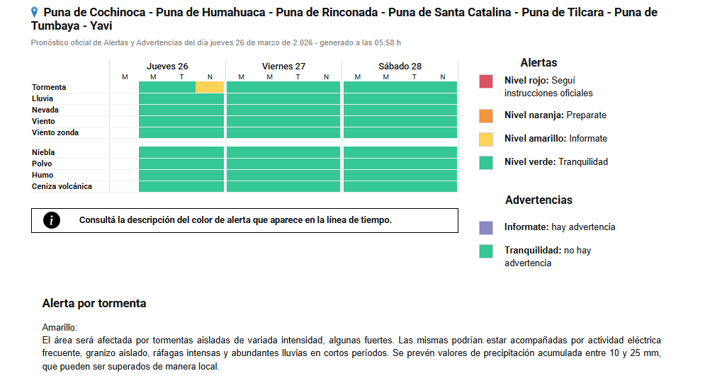De acuerdo al informe oficial, la alerta rige principalmente para zonas de la Puna y sectores cordilleranos, donde se esperan tormentas aisladas de variada intensidad, algunas localmente fuertes. Estos fenómenos podrían estar acompañados por actividad eléctrica frecuente, ráfagas intensas, caída ocasional de granizo y abundante lluvia en cortos períodos, con valores de precipitación acumulada estimados entre 10 y 25 milímetros, que podrían superarse de forma puntual.