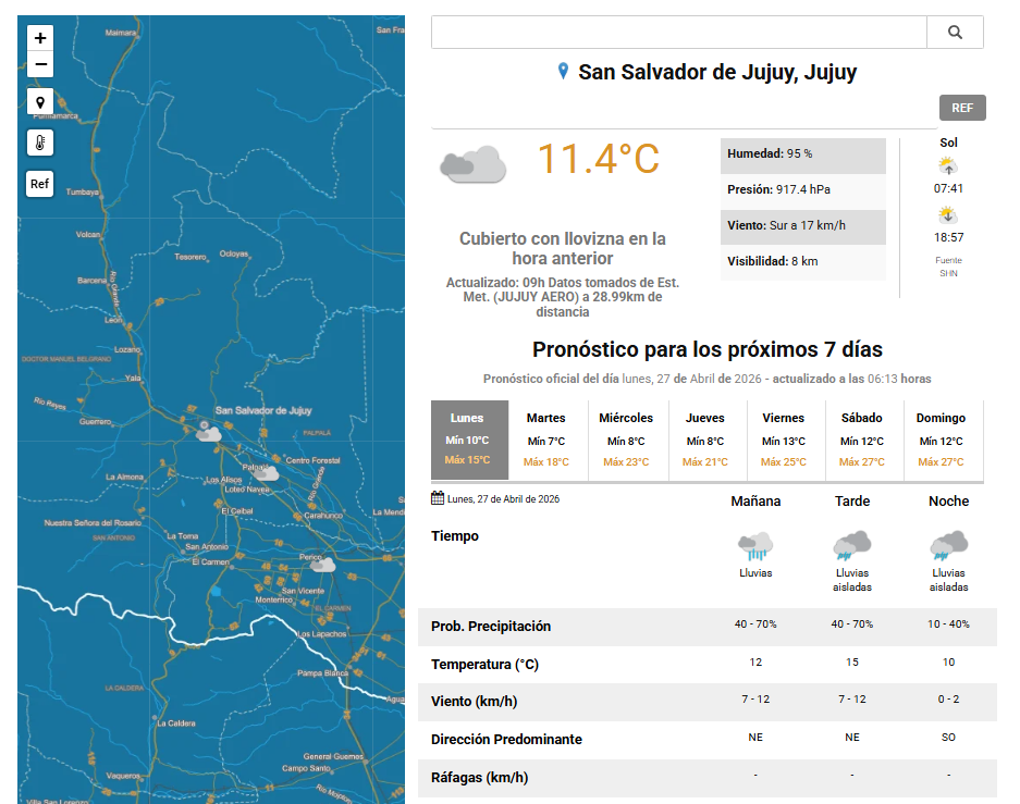 San Salvador de Jujuy y localidades aledañas amanecieron este lunes 27 de abril con un escenario climático que rompe con la tendencia de las semanas previas. El ingreso de una masa de aire frío proveniente del sur del país ha generado un desplome en el termómetro, registrando mínimas de 9°C y una máxima que, según el Servicio Meteorológico Nacional, difícilmente superará los 15°C durante la tarde.