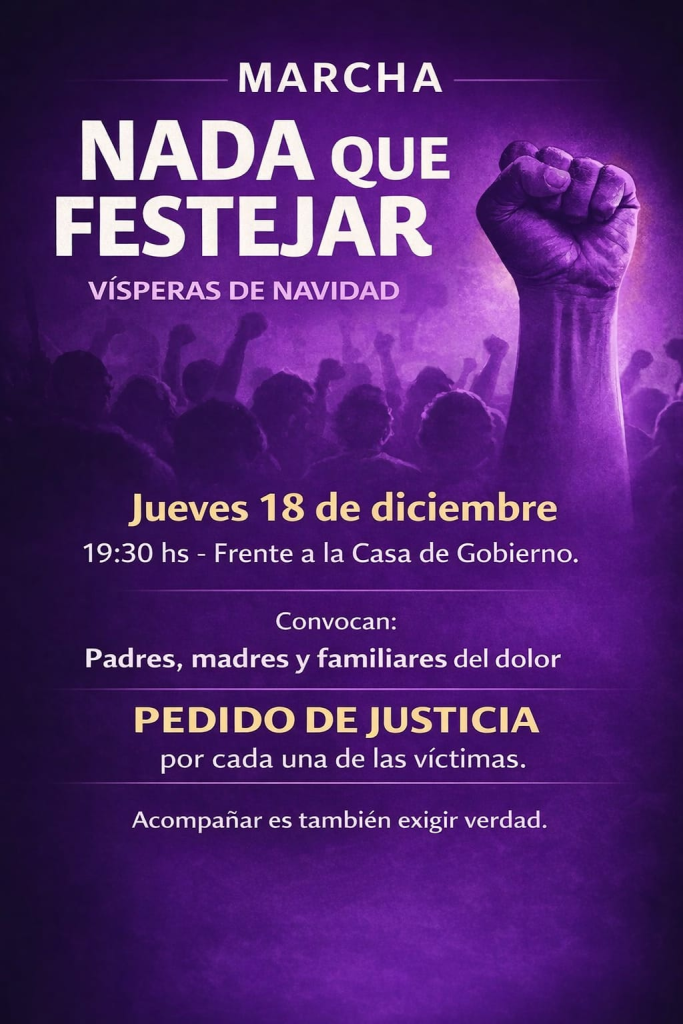 Este jueves por la tarde, Madres y Padres del Dolor volverán a movilizarse en San Salvador de Jujuy bajo la consigna “Nada que festejar”, en reclamo de justicia por las víctimas de femicidios, asesinatos y accidentes de tránsito. La concentración está prevista para las 19:30 frente a la Casa de Gobierno, con una marcha de las velas abierta a toda la comunidad.