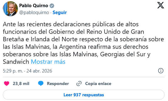 En la misma línea, reforzó que “El derecho de los isleños a la autodeterminación es primordial, y la soberanía recae en el Reino Unido. Esa ha sido nuestra postura constante y seguirá siéndolo”.