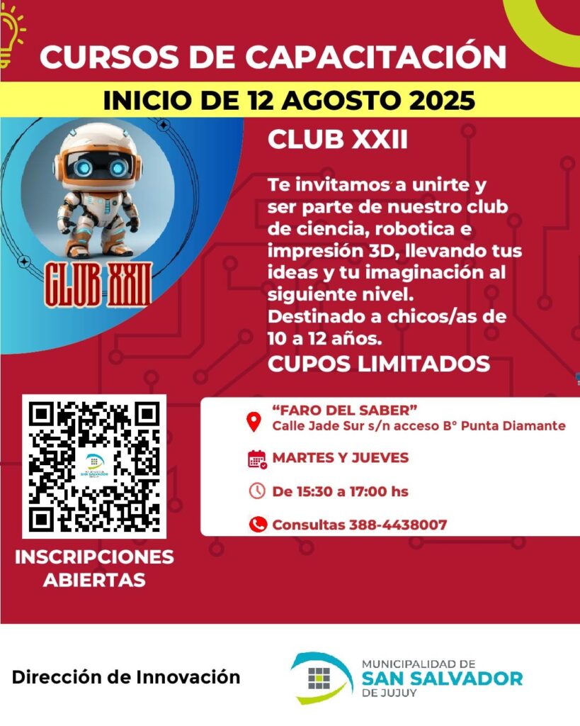 Entre los talleres disponibles se encuentran alfabetización digital, diseño gráfico, marketing en redes sociales, seguridad informática, reparación de celulares y uso básico de teléfonos móviles. También continuará funcionando el Club XXII, un espacio de formación en robótica e impresión 3D destinado a niñas y niños de entre 10 y 12 años.