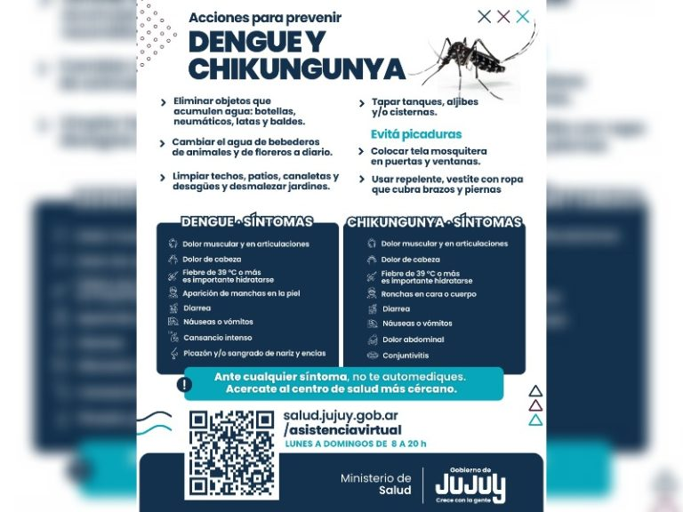 Asimismo, se recuerda que los síntomas de chikungunya pueden ser similares a los del dengue, incluyendo fiebre alta, dolor muscular y articular, malestar general y erupciones cutáneas. Ante la aparición de estos signos, se recomienda consultar de manera inmediata al sistema de salud.