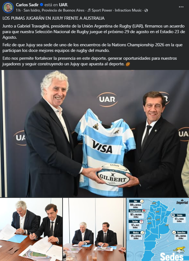 El anuncio fue ratificado por el gobernador Carlos Sadir, quien destacó la importancia del convenio desde sus redes personales, rubricado junto al presidente de la UAR, Gabriel Travaglini. El encuentro formará parte del calendario de uno de los torneos más relevantes del rugby internacional, que reúne a las principales selecciones del hemisferio sur y a equipos invitados, consolidándose como una competencia de primer nivel.