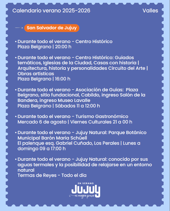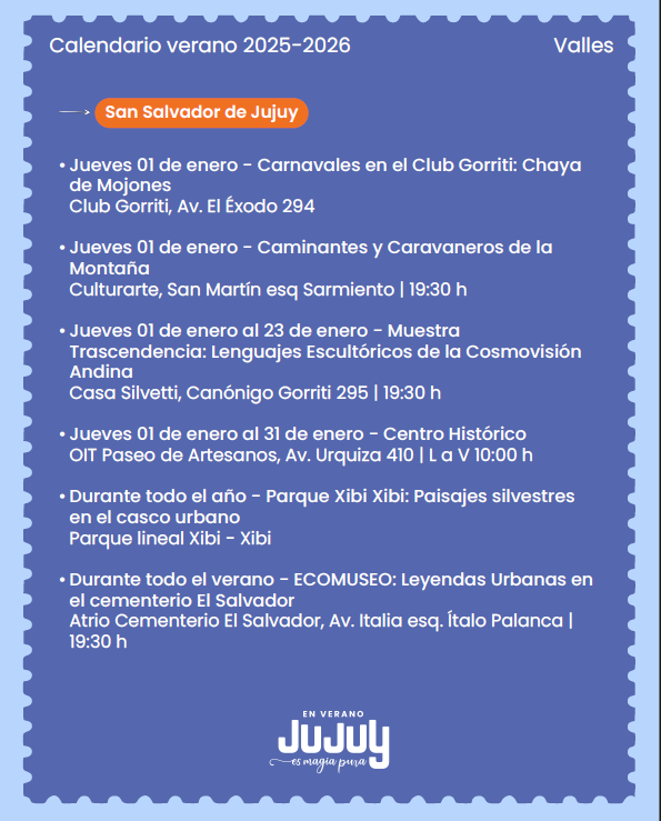 El funcionario señaló que la agenda incluye iniciativas en toda la provincia, con especial presencia en la Quebrada, la Puna, las Yungas y los Valles, además de una fuerte oferta en la capital jujeña. “Son muchísimas actividades que hemos ido recolectando de todos los municipios, más de trescientas actividades durante todo el verano”, indicó Posadas, al tiempo que resaltó la apertura de centros culturales, teatros y espacios públicos con propuestas permanentes.