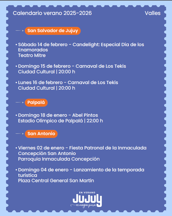 Durante la presentación, Posadas remarcó que Jujuy atraviesa una temporada alta de actividades culturales, aprovechando las características del destino: el clima, la diversidad de paisajes y la riqueza cultural de sus cuatro regiones. “La idea es seguir trabajando para aumentar el pernocte, para que la gente tenga más cosas para hacer, para que el jujeño también sepa todas las cosas que tiene para disfrutar”, expresó el ministro. Las propuestas comenzarán desde los primeros días de enero y se extenderán a lo largo de todo el verano, con eventos culturales, artísticos, turísticos y tradicionales.