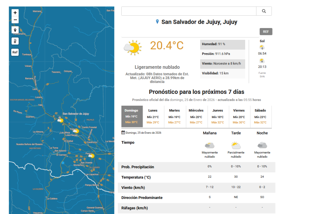 En cuanto a la capital provincial, el pronóstico para San Salvador de Jujuy indica una jornada de domingo con cielo mayormente a parcialmente nublado y baja probabilidad de precipitaciones durante el día. La temperatura máxima rondaría los 30 grados, mientras que hacia la noche se espera un leve descenso térmico y aumento de nubosidad. Para el inicio de la semana, no se descarta la inestabilidad, en consonancia con el alerta vigente para otras regiones de la provincia.