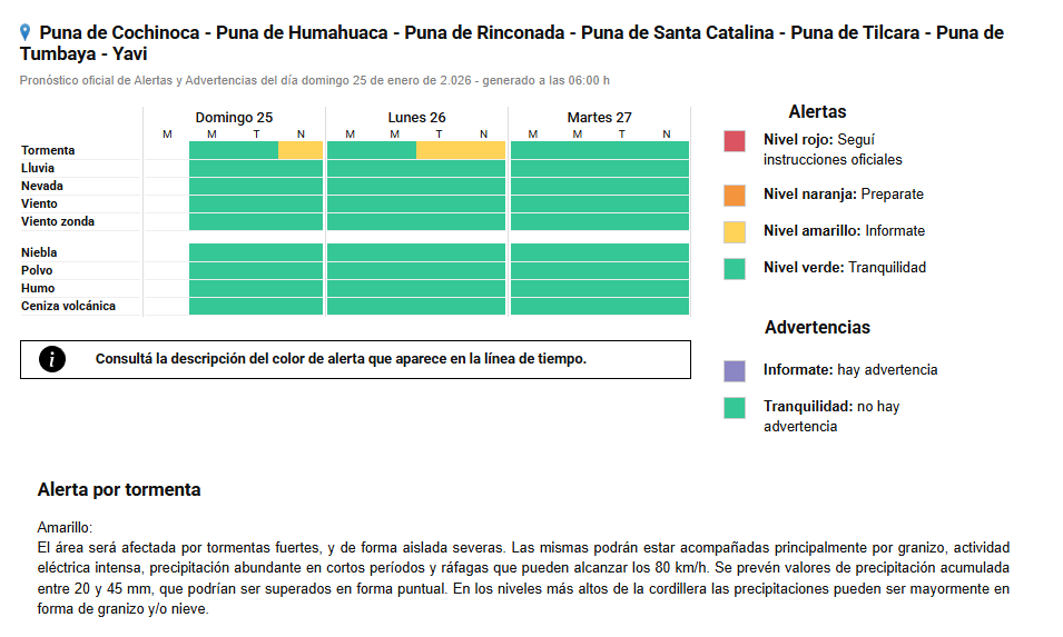 Las zonas bajo alerta en la región puneña incluyen a la Puna de Cochinoca, Puna de Humahuaca, Puna de Rinconada, Puna de Santa Catalina, Puna de Tilcara, Puna de Tumbaya y Yavi. En estos sectores, el SMN anticipa episodios de tormentas tanto durante la noche del domingo como a lo largo del lunes, con mayor probabilidad de eventos intensos en horarios vespertinos y nocturnos.