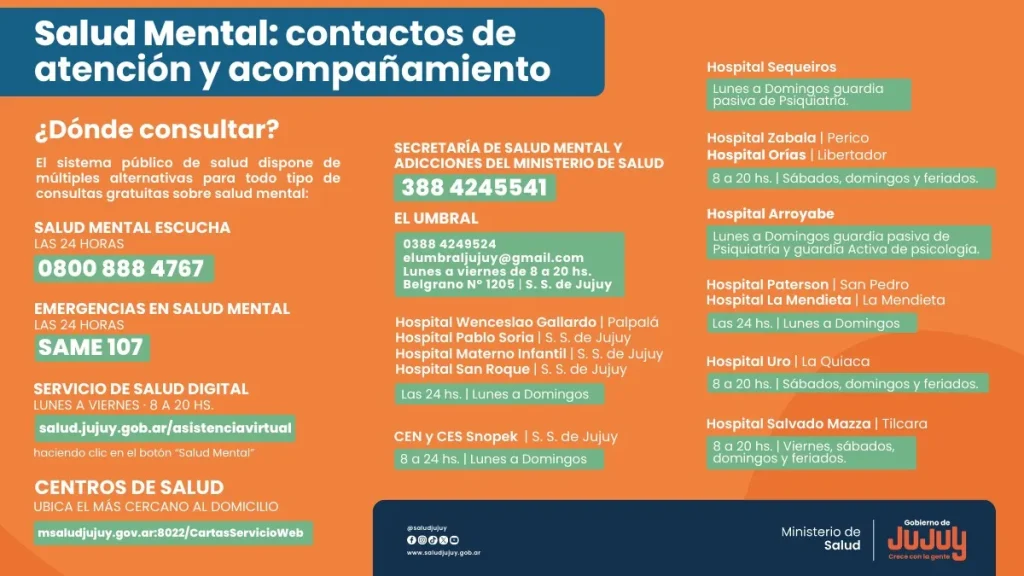 El Ministerio de Salud de Jujuy recordó a la comunidad que SAME Salud Mental está disponible las 24 horas del día, integrando una red de servicios públicos y gratuitos a la que se puede acceder mediante los números 107 o 0800 888 4767. Este equipo interdisciplinario atiende urgencias, emergencias y brinda asesoramiento en salud mental, reforzando el compromiso provincial con la atención integral y humanizada.
